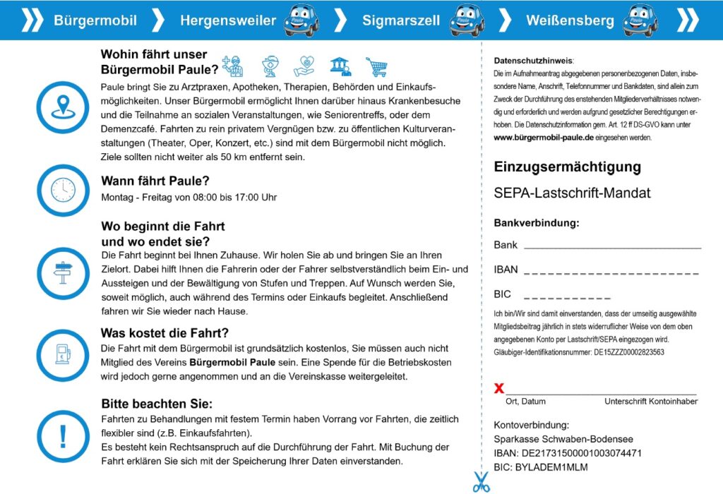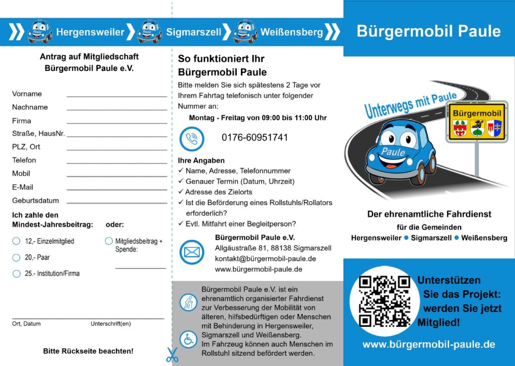Der Bürgermobil Paule e.V. ist ein ehrenamtlich organisierter Fahrdienst zur Verbesserung der Mobilität von älteren, hilfsbedürftigen oder Menschen mit Behinderung in Hergensweiler, Sigmarszell und Weißensberg. Im Fahrzeug können auch Menschen im Rollstuhl sitzend befördert werden.